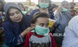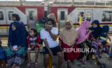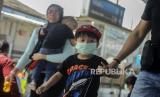 Penumpang memakaikan masker kepada anaknya di Stasiun Depok, Depok, Jawa Barat, Jumat (6/3). (FOTO : Republika/Putra M. Akbar)