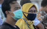 Seorang penumpang memakai penutup muka saat menunggu kereta di Stasiun Depok, Depok, Jawa Barat, Jumat (6/3). (FOTO : Republika/Putra M. Akbar)