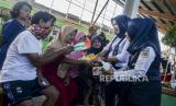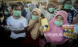 Sejumlah petugas memberikan masker kepada penumpang di Stasiun Depok, Depok, Jawa Barat, Jumat (6/3). (FOTO : Republika/Putra M. Akbar)