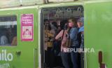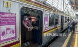 Sejumlah penumpang memakai masker saat menaiki kereta di Stasiun Depok, Depok, Jawa Barat, Jumat (6/3). (FOTO : Republika/Putra M. Akbar)