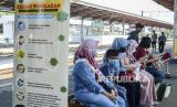 Sejumlah penumpang memakai masker saat sosialisasi antisipasi virus Corona di Stasiun Depok, Depok, Jawa Barat, Jumat (6/3). (FOTO : Republika/Putra M. Akbar)