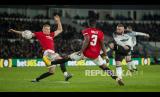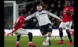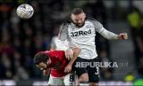 Wayne Rooney (kanan) melepas tembakan pada laga antara Derby County dan Manchester United di Pride Park, Derby, Inggris, Jumat (5/3) dini hari. (FOTO : Peter Powell/EPA EFE)