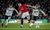 Scott McTominay (tengah) diadang Louie Sibley (kanan) and Max Bird (kiri) pada laga antara Derby County dan Manchester United di Pride Park, Derby, Inggris, Jumat (5/3) dini hari. (FOTO : Peter Powell/EPA EFE)