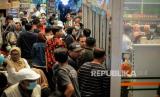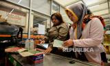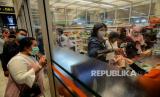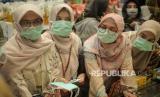 Sejumlah warga mengantre membeli masker saat operasi pasar masker di JakMart, Pasar Pramuka, Jumat (6/3). (FOTO : Republika/Thoudy Badai)