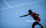 Petenis tunggal putra asal Kenya Ismael CR Mzai mengembalikan bola ke arah lawannya asal Indonesia David Agung Susanto pada babak play off Grup Dunia II Piala Davis di Stadion Tenis Gelora Bung Karno, Jakarta, Jumat (6/3). (FOTO : Republika/Thoudy Badai)