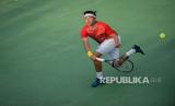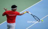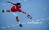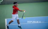 Petenis tunggal putra Indonesia David Agung Susanto mengembalikan bola ke arah lawannya asal Kenya Ismael CR Mzai pada babak play off Grup Dunia II Piala Davis di Stadion Tenis Gelora Bung Karno, Jakarta, Jumat (6/3). (FOTO : Republika/Thoudy Badai)