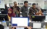 Direktur Utama PT Bank Tabungan Negara (Persero) Tbk. Pahala N Mansury (kanan), didampingi Kepala Kantor Wilayah 1 Manahan Hutapea, Komisaris Utama Chandra Hamzah (dari kiri) mengecek kesiapan usai meresmikan gedung baru Kantor Wilayah 1 BTN di Bekasi, Jawa barat, Jumat (6/3). (FOTO : Republika/Tahta Aidilla)