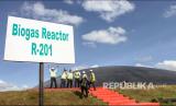 Sejumlah karyawan PTPN V berada di kawasan Pembangkit Listrik Tenaga Biogas (PLTBg) usai diresmikan di Pabrik Kelapa Sawit Terantam di Desa Kasikan, Kabupaten Kampar, Riau, Jumat (6/3/2020). PLTBG ini memanfaatkan limbah cair kelapa sawit menjadi listrik sebagai energi baru dan terbarukan. (FOTO : Ronny Muharman/Antara)
