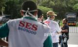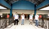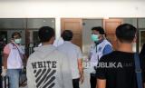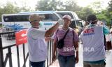 Pemeriksaan Suhu Tubuh Pemain. Petugas Sleman Emergency Services (SAS) memeriksa suhu tubuh pemain dan official Tim Tira Persikabo sebelum pertandingan Liga 1 2020 di Stadion Maguwoharjo, Sleman, Yogyakarta, Ahad (8/3). (FOTO : Wihdan Hidayat/ Republika)