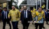 Ketua Umum Partai Golkar Airlangga Hartarto berjalan bersama Ketua Umum Partai NasDem Surya Paloh saat menggelar pertemuan di DPP Partai Golkar, Slipi, Jakarta, Senin (9/3). (FOTO : Republika/Putra M. Akbar)