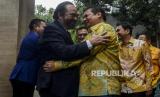 Ketua Umum Partai Golkar Airlangga Hartarto berpelukan dengan Ketua Umum Partai NasDem Surya Paloh saat menggelar pertemuan di DPP Partai Golkar, Slipi, Jakarta, Senin (9/3). (FOTO : Republika/Putra M. Akbar)