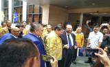 Ketua Umum Partai Nasdem Surya Paloh Disambut Ketua Umum Partai Golkar Airlangga Hartarto saat tiba di Kantor DPP Partai Golkar, Slipi, Jakarta, Senin (9/3). (FOTO : Febrianto Adi Saputro)