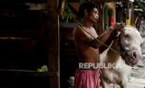 Pekerja membersihkan kulit kuda delman saat perawatan di kawasan Slipi, Jakarta, Senin (9/3). Kandang kuda yang lokasinya berada di pinggiran bantaran kali ini merupakan tempat kuda delman yang biasa mangkal di seputar kawasan Monas dirawat mulai dari diberikan makan, minum, dibersihkan kulit hingga rambutnya. (Republika/Putra M Akbar) (FOTO : Republika/Putra M Akbar)