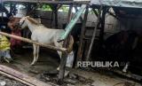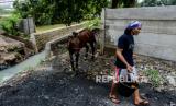Pekerja menggiring kuda delman untuk melakukan perawatan di kawasan Slipi, Jakarta, Senin (9/3). Kandang kuda yang lokasinya berada di pinggiran bantaran kali ini merupakan tempat kuda delman yang biasa mangkal di seputar kawasan Monas dirawat mulai dari diberikan makan, minum, dibersihkan kulit hingga rambutnya. (Republika/Putra M Akbar) (FOTO : Republika/Putra M Akbar)