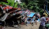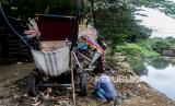 Pekerja memperbaiki gerobak delman di kawasan Slipi, Jakarta, Senin (9/3). Kandang kuda yang lokasinya berada di pinggiran bantaran kali ini merupakan tempat kuda delman yang biasa mangkal di seputar kawasan Monas dirawat mulai dari diberikan makan, minum, dibersihkan kulit hingga rambutnya. (Republika/Putra M Akbar) (FOTO : Republika/Putra M Akbar)