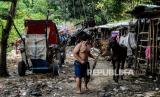 Sejumlah gerobak delman yang terparkir di kawasan Slipi, Jakarta, Senin (9/3). Kandang kuda yang lokasinya berada di pinggiran bantaran kali ini merupakan tempat kuda delman yang biasa mangkal di seputar kawasan Monas dirawat mulai dari diberikan makan, minum, dibersihkan kulit hingga rambutnya. (Republika/Putra M Akbar) (FOTO : Republika/Putra M Akbar)