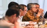 Gubernur Bank Indonesia (BI) Perry Warjiyo (kanan) berbincang dengan Ketua Dewan Komisioner Otoritas Jasa Keuangan (OJK) Wimboh Santoso (kedua kanan) sebelum mengikuti rapat terbatas (ratas) di Kantor Presiden, Jakarta, Senin (9/3/2020). (FOTO : Antara/Hafidz Mubarak A)