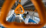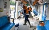 Petugas membersihkan gerbong kereta Light Rail Transit (LRT) dengan menggunakan cairan disinfektan di Depo Light Rail Transit (LRT) Sumatera Selatan, Palembang, Selasa (10/3/2020).  (FOTO :  Antara/Nova Wahyudi )