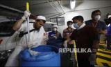 Muslim Manila mencuci tangan dengan cairan alkohol usai shalat berjamaah di masjid Greenhills, San Juan, Metro Manila, Filipina, pekan lalu.(Rolex Dela Pena/EPA-EFE) (FOTO : Rolex Dela Pena/EPA-EFE)