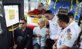 Gubernur Jawa Barat Ridwan Kamil bersama jajaran terkait dan penumpang melakukan uji coba bus saat peluncuran bus Damri Ramah Bagi Lansia, Difabel dan Lingkungan, di halaman Monumen Juang Jawa Barat (Monju), Kota Bandung, Rabu (11/3).(Republika/Edi Yusuf) (FOTO : Republika/Edi Yusuf)