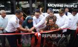 Gubernur Jawa Barat Ridwan Kamil bersama jajaran terkait dan calon penumpang menggunting pita saat uji coba dan peluncuran bus Damri Ramah Bagi Lansia, Difabel dan Lingkungan, di halaman Monumen Juang Jawa Barat (Monju), Kota Bandung, Rabu (11/3). (Edi Yusuf/Republika) (FOTO : Edi Yusuf/Republika)
