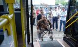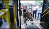 Uji coba bus saat peluncuran bus Damri Ramah Bagi Lansia, Difabel dan Lingkungan di halaman Monumen Juang Jawa Barat (Monju), Kota Bandung, Rabu (11/3). (Edi Yusuf/Republika) (FOTO : Edi Yusuf/Republika)