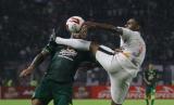 Pesepak bola Persebaya David Aparecido Da Silva (kiri) berebut bola dengan pesepak bola Persipura Donny Harold Monim pada pertandingan Liga 1 2020 di Stadion Gelora Bung Tomo, Surabaya, Jawa Timur, Jumat (13/3/2020). Persipura berhasil mengalahkan Persebaya dengan skor 4-3. ANTARA FOTO/Moch Asim/aww.(Moch Asim/ANTARA FOTO) (FOTO : Moch Asim/ANTARA FOTO)