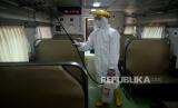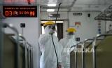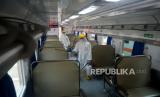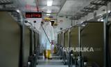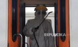 REPUBLIKA.CO.ID, JAKARTA -- Petugas menyemprotkan cairan disinfektan di bagian dalam gerbong kereta di Stasiun Senen, Jakarta, Ahad (15/3).