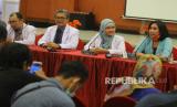 Direktur Rumah Sakit Universitas Airlangga (RSUA) Nasronudin (kedua kanan) didampingi Ketua Satgas Corona RSUA Prastuti Asta Wulaningrum (kanan), Jubir Satgas Corona RSUA Alfian Nur Rosyid (kedua kiri) serta moderator Suko Widodo (kiri) memberikan keterangan pers di Surabaya, Jawa Timur, Senin (16/3/2020). (Antara/Moch Asim) (FOTO : Antara/Moch Asim)