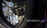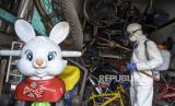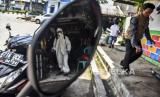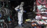 Petugas dari Dispangtan Kota Cimahi menyemprotkan cairan disinfektan di kios onderdil sepeda di Pasar Citereup, Jalan Sangkuriang, Kota Cimahi, Selasa (17/3). Penyemprotan cairan disinfektan secara menyeluruh ke setiap sudut dan kios di kawasan tersebut bertujuan untuk mencegah sekaligus mengantisipasi penyebaran virus Corona (Covid-19) yang telah ditetapkan sebagai pandemi oleh Organisasi Kesehatan Dunia (WHO). Foto: Abdan Syakura(Abdan Syakura ) (FOTO : Abdan Syakura )