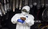 Petugas dari Dispangtan Kota Cimahi menggunakan alat pelindung diri (APD) berada di area Pasar Citereup, Jalan Sangkuriang, Kota Cimahi, Selasa (17/3). Penyemprotan cairan disinfektan secara menyeluruh ke setiap sudut dan kios di kawasan tersebut bertujuan untuk mencegah sekaligus mengantisipasi penyebaran virus Corona (Covid-19) yang telah ditetapkan sebagai pandemi oleh Organisasi Kesehatan Dunia (WHO). Foto: Abdan Syakura(Abdan Syakura) (FOTO : Abdan Syakura)