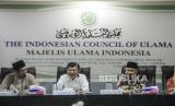 Wakil Ketua Umum MUI Muhyiddin Junaidi (kedua kanan) bersama Ketua Umum Dewan Masjid Indonesia Jusuf Kalla (kedua kiri) menyampaikan keterangan pers terkait Fatwa Nomor 14 Tahun 2020 tentang penyelenggaraan ibadah dalam situasi wabah Corona atau Covid-19 di kantor MUI, Jakarta, Selasa (17/3). Fatwa MUI itu mengatur diantaranya membolehkan masyarakat untuk mengganti Shalat Jumat dengan Shalat Zuhur untuk mencegah penyebaran Corona bagi orang-orang sehat dan melarang sementara pelaksanaan ibadah yang membuat konsentrasi massa bagi umat Islam di wilayah yang kondisi penyebaran virus corona sudah tidak terkendali. Republika/Putra M. Akbar(Republika/Putra M. Akbar) (FOTO : Republika/Putra M. Akbar)