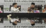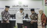 REPUBLIKA.CO.ID, JAKARTA -- Wakil Ketua Umum MUI Muhyiddin Junaidi menyerahkan naskah Fatwa Nomor 14 Tahun 2020 tentang penyelenggaraan ibadah dalam situasi wabah COVID-19 kepada Ketua Umum Dewan Masjid Indonesia (DMI) Jusuf Kalla di Jakarta, Selasa (17/3/2020).