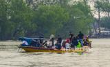 Pengunjung menaiki perahu untuk menuju lokasi konservasi lutung jawa dan wisata mangrove di Muaragembong, Kabupaten Bekasi, Jawa Barat.(FAKHRI HERMANSYAH/ANTARA FOTO) (FOTO : FAKHRI HERMANSYAH/ANTARA FOTO)