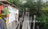 Daman mengecek area jembatan kayu yang menjadi akses untuk pengunjung menuju lokasi konservasi lutung jawa di kawasan Mangrove Muaragembong, Kabupaten Bekasi, Jawa Barat.(ANTARA FOTO) (FOTO : ANTARA FOTO)