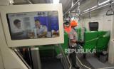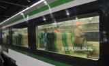 Petugas BPBD menyemprot disinfektan di gerbong KRDE bandara Minangkabau Ekspres, di Stasiun Simpang Haru, Padang, Sumatera Barat, Selasa (17/3/2020). PT KAI Divre II Sumbar bekerjasama dengan BPBD Padang melakukan penyemprotan disinfektan di kereta bandara dan kereta api wisata mengantisipasi penyebaran Covid-19. (FOTO : ANTARA FOTO)