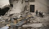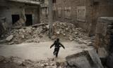 Seorang anak berjalan di dekat rumah yang hancur akibat serangan udara di kota Idlib, Suriah. (AP Photo/Felipe Dana)(AP) (FOTO : AP)