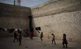 Sejumlah anak kecil bermain di dalam bangunan bekas penjara yang sekarang diubah menjadi sebuah kamp untuk orang-orang terlantar akibat pertempuran, di Idlib, Suriah. (Foto AP / Felipe Dana)(AP) (FOTO : AP)