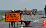 Pekerja memperbaiki aspal yang rusak di Jalan Tol Trans Sumatera (JTTS) kilometer 191 Ruas Terbanggibesar-Pematangpanggang-Kayuagung, Lampung, Selasa (17/3/2020). Perbaikan tersebut guna mengantisipasi terjadinya kecelakaan serta memberikan kenyamanan pengguna tol tersebut. ANTARA FOTO/Ardiansyah/aww.(ANTARA FOTO) (FOTO : ANTARA FOTO)