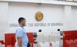 Seorang WNI berjalan di depan kantor Kedutaan Besar Republik Indonesia (KBRI) di Kuala Lumpur, Malaysia, Selasa (17/3/2020). Sejumlah layanan di KBRI KL terpaksa dihentikan untuk sementara waktu setelah Perdana Menteri Malaysia Muhyiddin Yassin mengumumkan bahwa pemerintah Malaysia memutuskan untuk melaksanakan (FOTO : ANTARA FOTO)