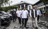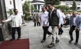 Menteri Dalam Negeri Tito Karnavian (tengah) didampingi Gubernur Jawa Barat Ridwan Kamil (kanan) berjalan menuju ruang rapat saat melakukan pertemuan di Gedung Sate, Kota Bandung, Rabu (18/3). Pertemuan tersebut membahas konsolidasi penanganan penyebaran virus Corona (Covid-19) di Indonesia. (ABDAN SYAKURA/REPUBLIKA) (FOTO : ABDAN SYAKURA/REPUBLIKA)