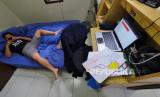 Siswa SMPN 5 Bandung Rakean Ahmad (14) mengerjakan tugas sekolah di kediamannya di Bandung, Rabu (18/3). (FOTO : Yogi Ardhi/Republika)