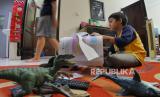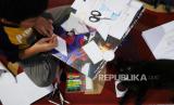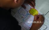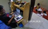 Kakak beradik Rakean Ahmad (kiri) dan Rahadian Ahmad (kanan) mengerjakan tugas sekolah di kediamannya di Bandung, Rabu (18/3). (FOTO : Yogi Ardhi/Republika)