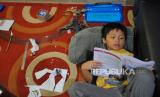 Siswa SDI Az Zakiyah Rahadian Ahmad (9) membaca buku tematik di kediamannya di Bandung, Rabu (18/3). (FOTO : Yogi Ardhi/Republika)