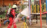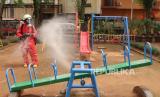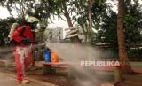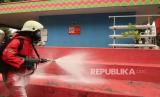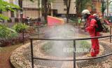 Petugas damkar (pemadam kebakaran) melakukan penyemprotan desinvektan di lingkungan RPTRA Nirmala, RW 04, Kelurahan Sunter Jaya, Jakarta, Kamis (19/3). Semakin tingginya tingkat korban virus Covid 19, upaya pencegahan penyebaran virus tersebut kian giat dilakukan di seluruh wilayah Jakarta. (Republika/Darmawan) (FOTO : Republika/Darmawan)