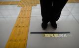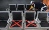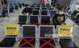 REPUBLIKA.CO.ID, JAKARTA -- Petugas Kerata Api menempelkan stiker tanda silang di kursi tunggu di Stasiun Pasar Senen, Jakarta, Kamis (19/3).