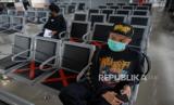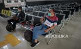 Warga menerapkan himbauan social distancing saat duduk di ruang tunggu di Stasiun Pasar Senen, Jakarta, Kamis (19/3). (Thoudy Badai/Republika) (FOTO : Thoudy Badai/Republika)