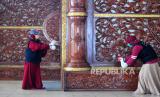 Relawan Palang Merah Indonesia (PMI) dan Aksi Cepat Tanggap (ACT) Jambi menyemprotkan cairan disinfektan di dalam Masjid Agung Al-Falah atau Masjid Setibu Tiang, Jambi, Kamis (19/3). (ANTARA/Wahdi Septiawan) (FOTO : ANTARA/Wahdi Septiawan)