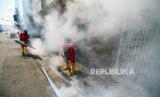 Petugas Pencegahan dan Pemberantasan Penyakit (P2P) melakukan pengasapan (fogging) di pusat kota Lhokseumawe, Aceh, Kamis (19/3). Kegiatan itu bertujuan untuk memberantas sarang nyamuk aedes aegyty guna mengantisipasi wabah penyakit demam berdarah dengue (DBD) di kota itu. (Antara/Rahmad) (FOTO : Antara/Rahmad)