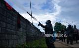 Anggota kepolisian Polda Sulsel menyemprotkan cairan di lokasi kegiatan Ijtima Ulama Asia di Desa Pakkatto, Kecamatan Bontomarannu, Kabupaten Gowa, Sulawesi Selatan, Kamis (19/3/2020). (Antara/Abriawan Abhe) (FOTO : Antara/Abriawan Abhe)